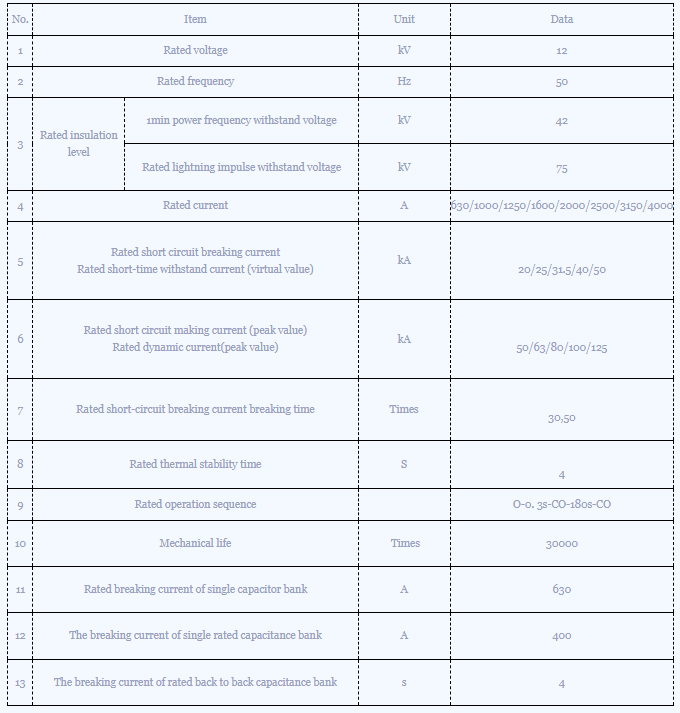 1. VCB целосен тип, главни технички спецификации, фазно растојание и количина