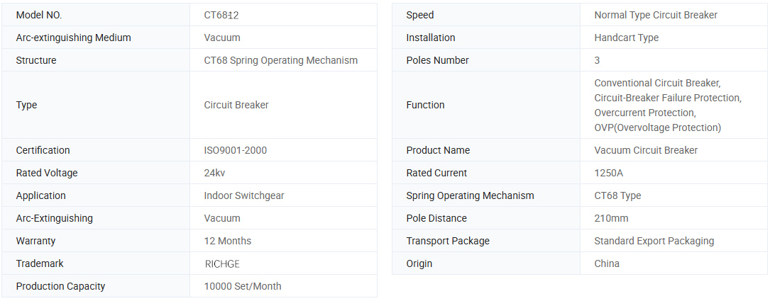 Модел CT68-12 Употреба на вакуумско коло за вакуумско коло со CT68 Пролетниот оперативен механизам. Таа е трифазна AC, 50 Hz опрема за дистрибуција на напојување во затворен простор со напон од 12kV, главно користена во дистрибуирани електроенергетски системи, рудници, нафта, хемиска индустрија, металургија, градежништво, транспорт, рудници за јаглен и општини, како и во системите за напојување и дистрибуција на урбани станбени згради и јавни објекти и други места. Широко се користи за да се заштити високо-напонската опрема за напојување од прекумерна струја, краток спој, под-напон и над-напон, и може со сигурност да се гарантира безбедно работење на опрема за напојување. Прекинувачот на колото има модуларен дизајн, каде што оперативниот механизам и телото на прекинувачот се раздвојуваат, дозволувајќи им на брзи замени и склопување.