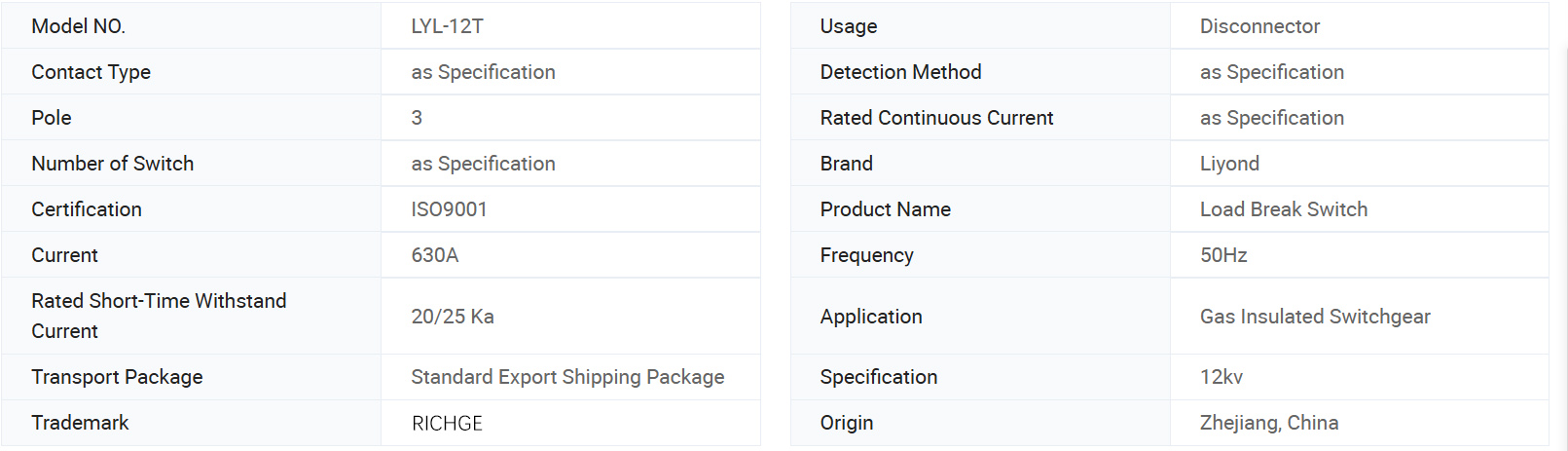 Прекинувачот за оптоварување LYL-12T е во согласност со релевантните барања на GB3804-2004 „3.6kV~40.5kV висок напонски прекинувач за оптоварување со наизменична струја“ и GB16926-1997 „Апарат за комбинација на прекинувач за оптоварување со висок напон со наизменична струја и комбинација на осигурувачи“.