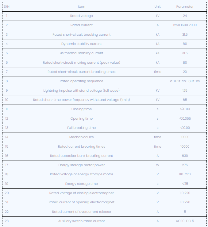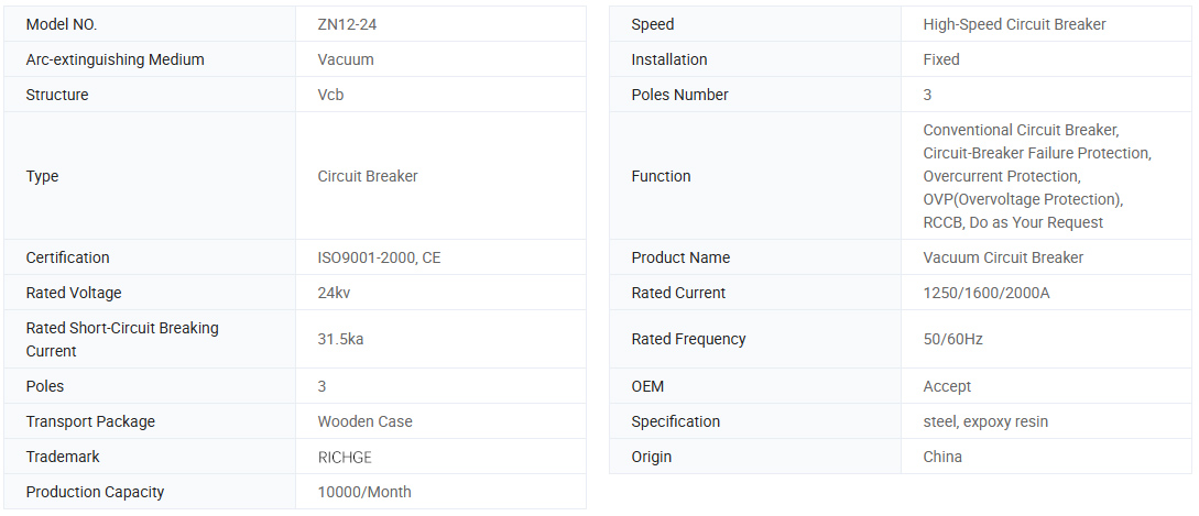 Прекинувачот на вакуумското коло Zn12-24 е затворен прекинувач со висок напон со номинален напон од 24kV и трифазен AC 50Hz. Неговиот оперативен механизам е пролетен вид на складирање на енергија, со кој може да се управува со AC или DC, или рачно. Овој прекинувач на колото е засилен тип на изолација, кој ги исполнува барањата на околината за употреба во загадени области од класа II. оптоварувања и честопати управувани места. Овој производ е во согласност со стандардот GB1984-89 „AC со висок напон“.