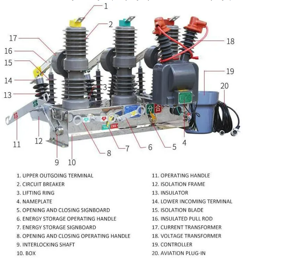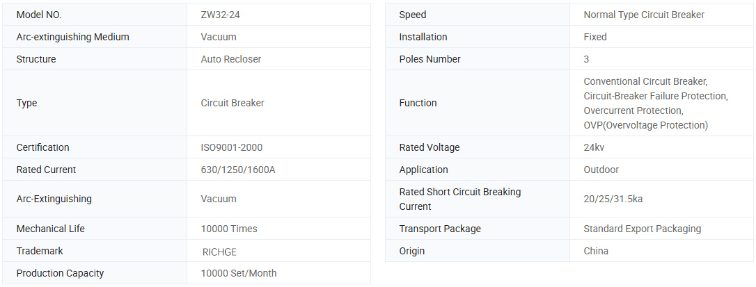 Може да биде опремена со пролетен механизам за работа, кој има основни функции, како што се струја на кршење и затворање на струјата, струјата на преоптоварување и струјата на краткиот спој. Тоа е основен тип на серија ZW32-24. Прекинувачот на колото и изолациониот прекинувач може да се комбинираат за да формираат „комбиниран прекинувач“ (во понатамошниот текст, наведен како „комбиниран прекинувач на колото“) со посебна фрактура. На изолациониот прекинувач, корисникот може да избере да ја користи силиконската гума изолациска обвивка, која има карактеристики на дожд, снег, песок и анти-загадување и корозија и може ефикасно да го избегне замрзнувањето и оксидацијата на изолациониот прекинувач.