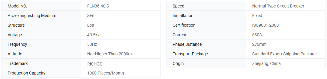 FLN36-40.5D/T630 Внатрешен сулфур хексафлуорид (SF6) прекинувач за оптоварување и FLN36-40.5DR/125 Комбинација на осигурувач на прекинувачи за оптоварување се погодни за електрани и индустриска електрична опрема со трифазна AC 50/60Hz прстенеста мрежа или терминално напојување. Тие се користат како заштита на контролата на оптоварувањето за електроенергетските системи. Прекинувачот за оптоварување ја дели и затвора струјата на оптоварувањето, струјата на затворена јамка, струјата за полнење со не-оптоварување и струјата за полнење со кабел; Комбинираните електрични уреди можат да ја срушат секоја струја под номинална струја со краток спој и се погодни за електрични комплетни комплети на опрема, како што се главни единици на прстенот и трафостаници од типот на кутијата.