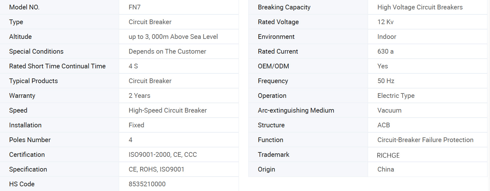 Високонапонски прекинувач за оптоварување FN7-12 AC е нов тип на внатрешен високонапонски прекинувач за оптоварување што произведува гас. Погоден е за трифазни AC електроенергетски системи со наизменична струја 50Hz и номинален напон од 12kV. Се користи за прекинување на струјата на оптоварување и за затворање на струјата на куса врска.