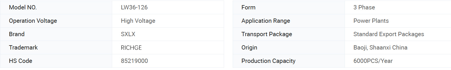 LW-126 Тип на отворено високо напон наизменична струја на струја сулфур хексафлуорид прекинувач (во понатамошниот текст како прекинувач на колото) е еден вид на отворено високо-напон прекинувач опрема со три столбови AC SoHzand што го усвојува SF6 гас како лак за изгадување на лак и средно средство за изолација. Може да се користи за раздвојување и комбинација на номинална струја и струја на струја, кондензаторска банка и прекинувачко коло, а исто така може да се користи како прекинувач за поврзување на AninterConnecting за да се реализира контролата и заштитата на далноводите и опремата, особено погодно за чести работи.