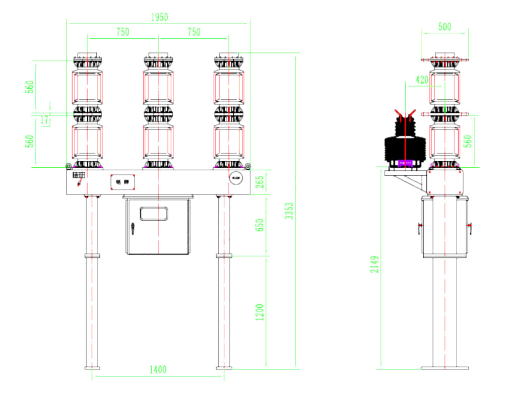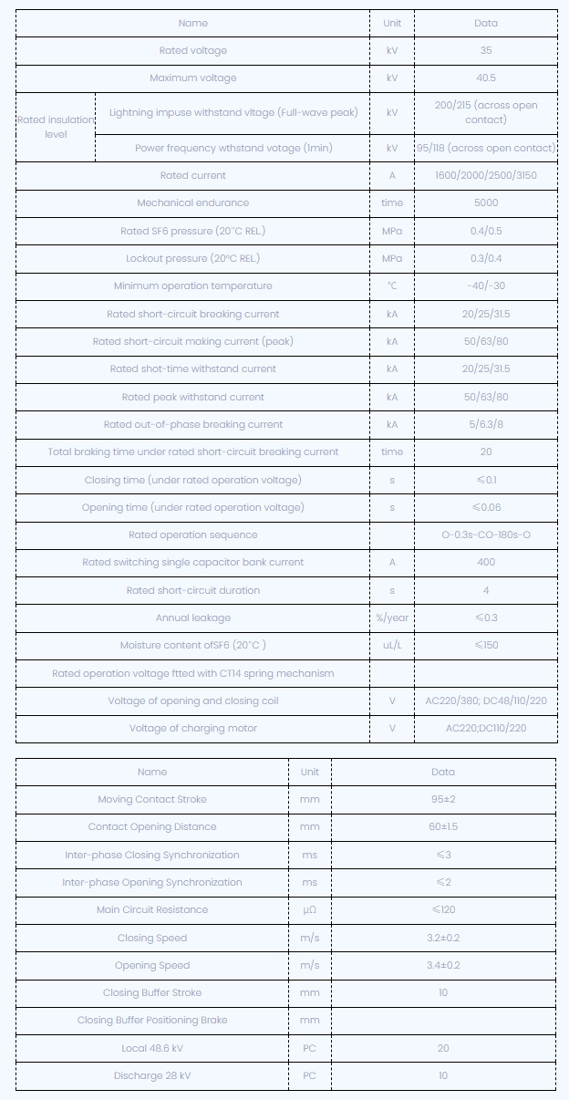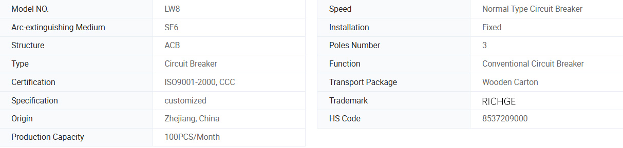 LW8-40.5, LW8A-40.5 SERIES SULFUR HEXAFLUORIDE CIRCUITER CORPUITS се трифазни AC 50Hz надворешна електрична опрема со високо напон, погодна за контрола и заштита на системот за пренос и дистрибуција на 40,5kV, може да се користи и за прекинувачи за врски и отворени и блиски кондензаторски банки. Производот може да се користи со пролетен механизам CT14. Прекинувачот на колото е во согласност со Националниот стандард GB1984-1989 AC со високонапонски прекинувач на AC и меѓународната електротехничка комисија стандард IEC56, IEC6220-100 прекинувач со високо напон на AC.