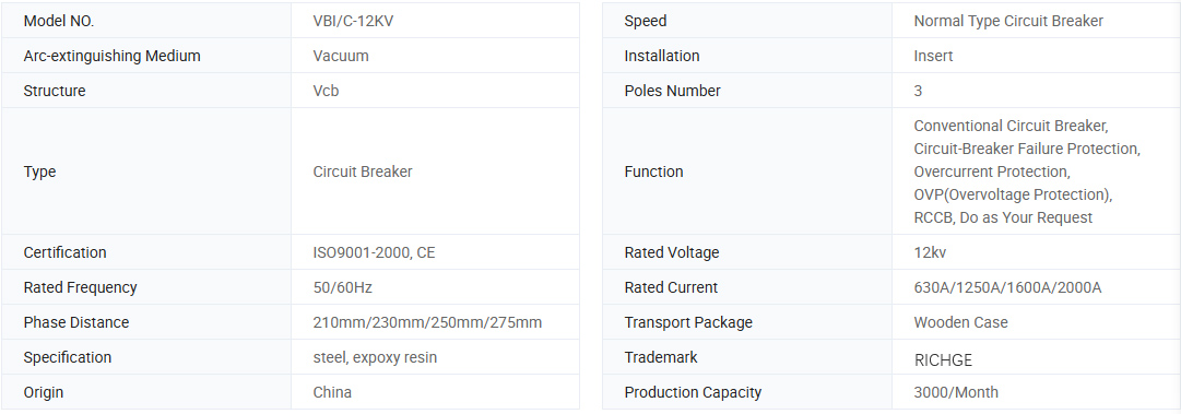 Прекинувачот на вакуумско коло на VBI-12 со среден напон е еден вид опрема за прекинувач со среден напон во затворен простор со 50Hz/60Hz три фаза AC 12KV оценет. Прекинувачот за вакуумско коло Voltagevbi е во согласност со Националниот стандард GB1984-2003 HV прекинувач за вакуумско коло, JB3855-1996<3.6-40.5kV indoor AC high voltage vacuum circuit breaker>, DL/T403-2000<12kv-40.5kv HV vacuum circuit breaker ordering technical conditions>, и IEC62271-100: 2001 Релевантни регулативи со високи напони на струја.
