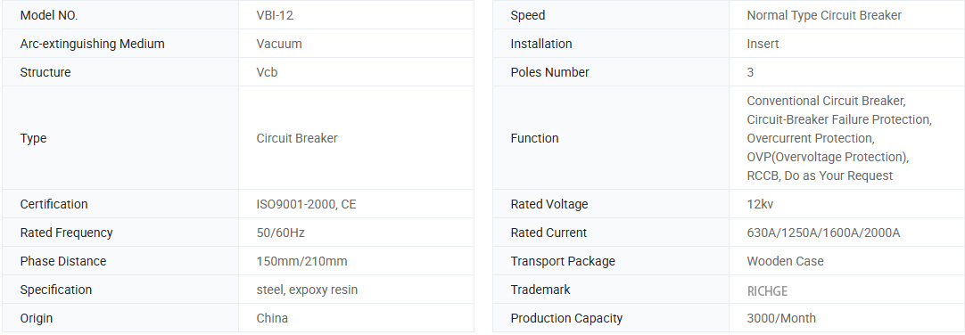 VBI-12 затворен прекинувач за вакуумско коло во затворен простор е трифазен AC 50Hz, номинален напон на уредот од 12KV затворен. За индустриските и рударските претпријатија, електрани и трафостаници како цели за контрола и заштита на електрична опрема и за чести работи на местото.