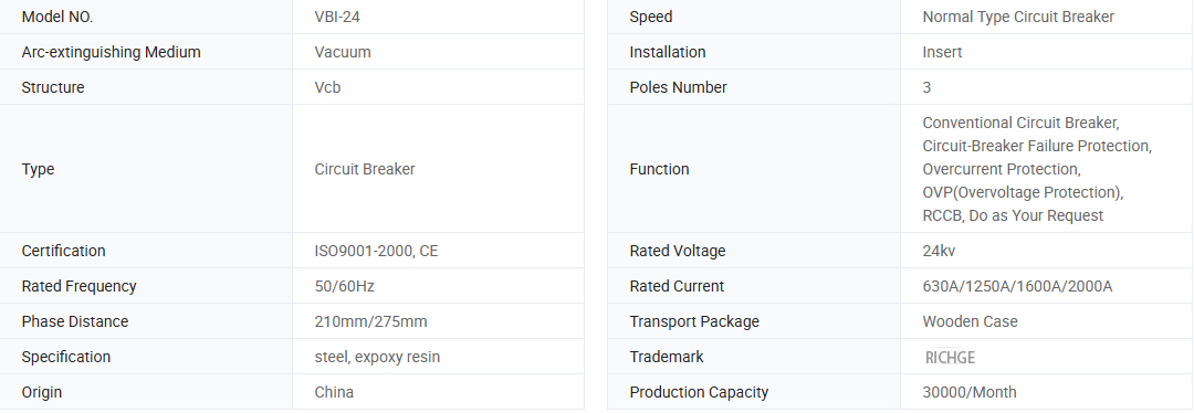 VBI-24 Внатрешен прекинувач на вакуумско коло во затворен напон е трифазен напон AC 50Hz , оценет напон од 24kV затворен уред , за индустриски и рударски претпријатија, електрани и трафостаници како цели за контрола и заштита на електрична опрема и за чести работи на местото.