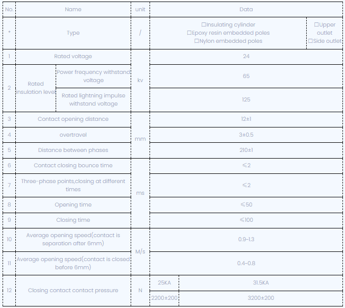 Механизмот за работа на VBI-24-тиот монтиран вакуумско коло од типот на типот се користи пролет за енергија за складирање, со што може да се управува со два начина, рачен или електричен. Карактеристиките се во согласност со GB1984-89 , JB3855-96 <10KV Внатрешен прекин на вакуумското коло за високо напон Општи технички спецификации>, релевантни одредби за IEC56 стандард.