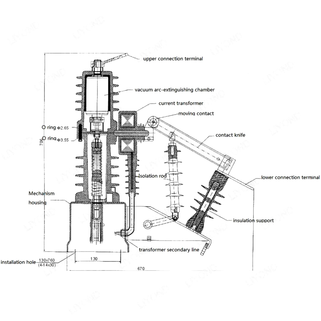 Изолацијата на вакуумскиот прекинувач усвојува силиконска гумена обвивка, со подолг живот, поголема сигурност, добра временска отпорност, удобен за транспорт, добар рејтинг. Оперативниот механизам усвојува минијатуризација, висок сигурен механизам за работа на пролетта, има предности на едноставна структура, механички живот до 10000 пати.