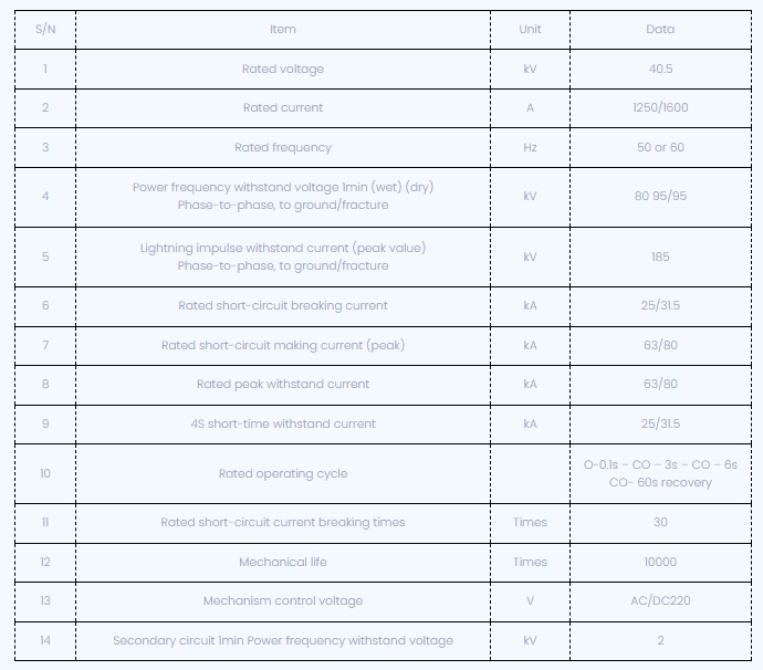 Главните карактеристики на прекинувачот се одлични перформанси на кршење, вакуумски лак, висок капацитет на кршење, механички живот до 10000 пати, едноставна структура, бесплатно одржување и долг циклус на одржување; Добра изведба на изолација и силна способност за анти -загадување; Тековните трансформатори можат да се инсталираат според барањата на клиентите, со точност за мерење до 0,2 ниво, овозможувајќи трифазна интеракција. Стандард: IEC 62271-100